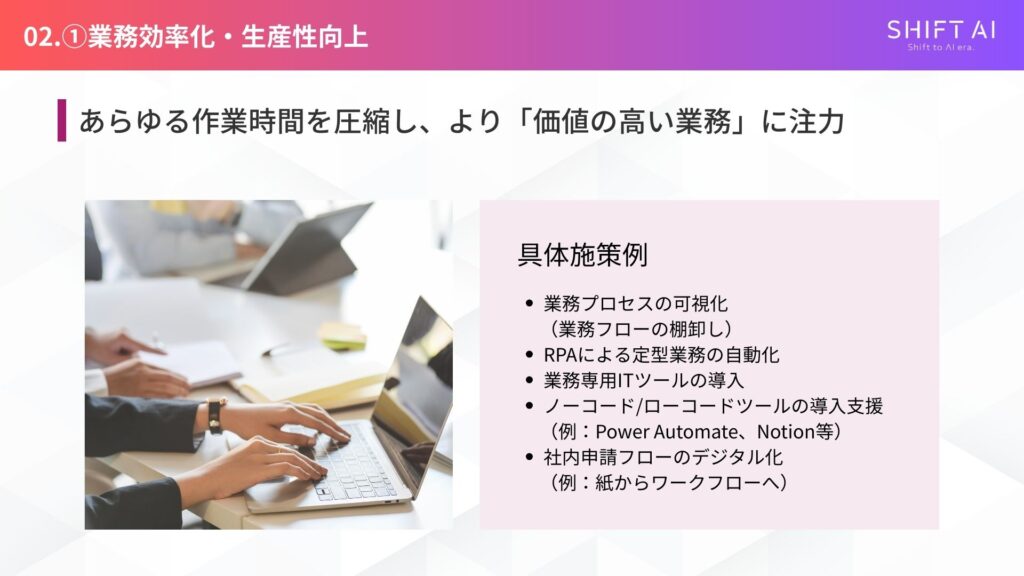 - 業務効率化を図りたいが、どこから手をつけていいか分からない