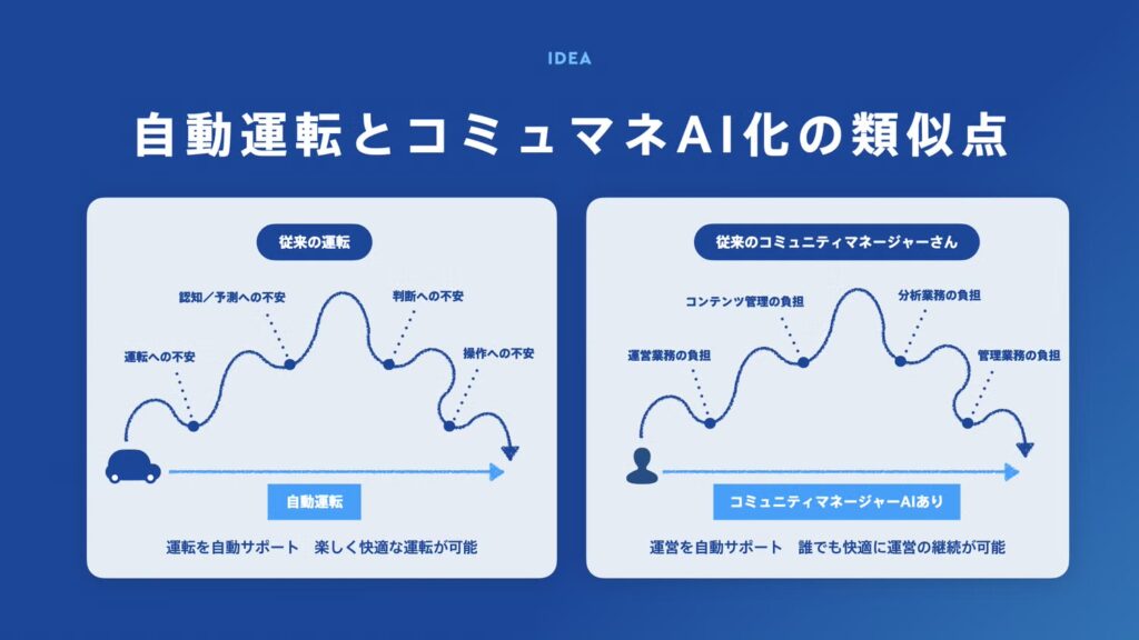 そして、コミュニティをマネージメントする時代を終わらせたいという同社の思いから「コミュニティマネージャーAI化」の構想が始まりました。
