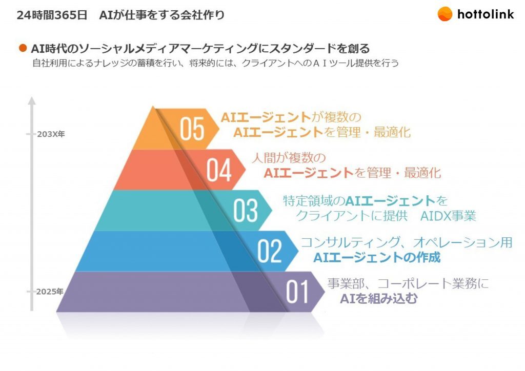 この課題意識のもと、CEOとの対話を通じて2025年春に生まれたのが、ホットリンクが描くAI活用の全体像を5つのフェーズで示した「AI活用ピラミッド」です。