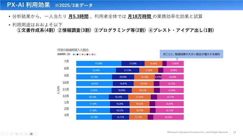 「2025年3月時点のデータでは、1人あたりで月間5.3時間、利用者全体で月18万時間の業務時間削減に成功しました。1ヶ月で60分の削減に成功した割合も、月を重ねる度に増えている状況です」